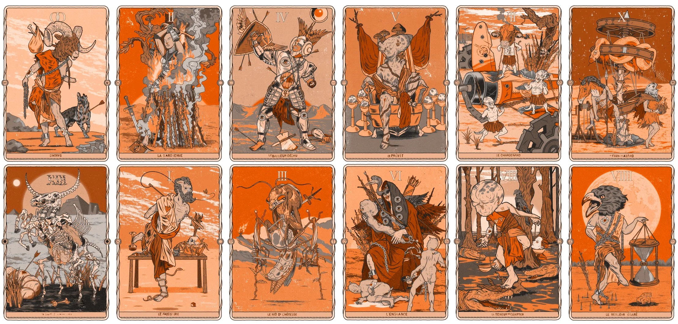 TheThief’sTarot is almost there. Here’s a preview of some of the cards. Not the real color palette, though.